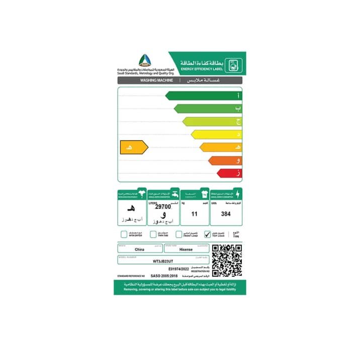 خصائص غسالة هايسنس 11 كيلو علوية 75% تنشيف – رمادي WT3JB23UT :