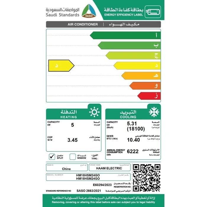 يتميز مكيف سبليت هام الذهبي بسعة 18100 وحدة حرارية، ما يمنحه القوة الكافية لتبريد أو تدفئة المساحات الكبيرة بسرعة وكفاءة عالية. هذا يضمن راحة فورية وبيئة مثالية للاستخدام المنزلي أو المكتبي طوال العام.