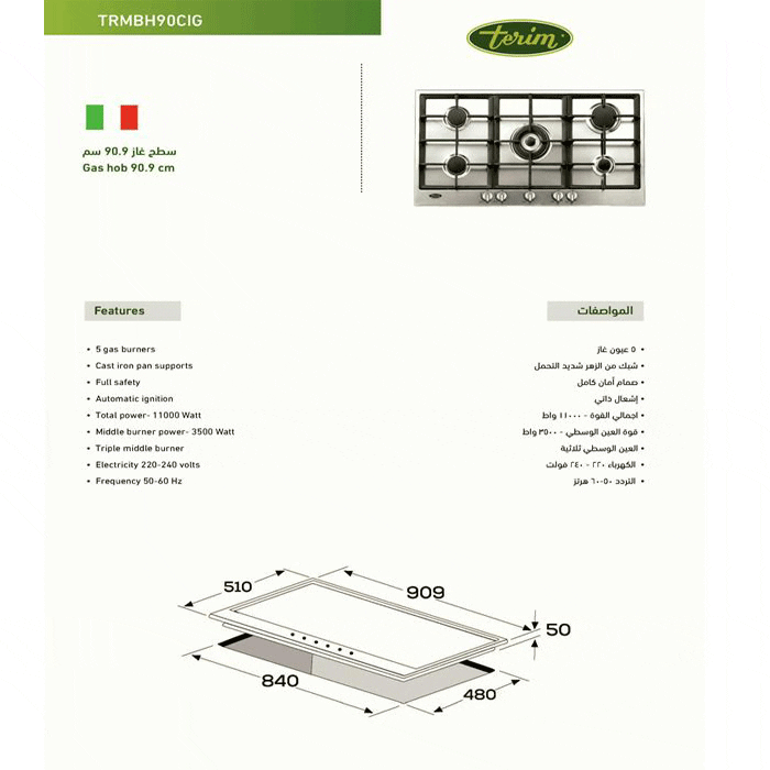 يحتوى هاذ المسطح من تيرم على 5 شعلات غاز ذات احجام مختلفة لتناسب كافة المأكولات وذات شعلات قوية و ثابتة تعمل بكفاءة تشغيل رائعه ومميزه و يتمتع بأنه ذات امان كامل للحماية فيمنحك الشعور بالراحة والاطمئنان اثناء الاستخدام كما انه مزود بجهاز للحماية من اللهب وذلك لضمان الامان لك ولأسرتك