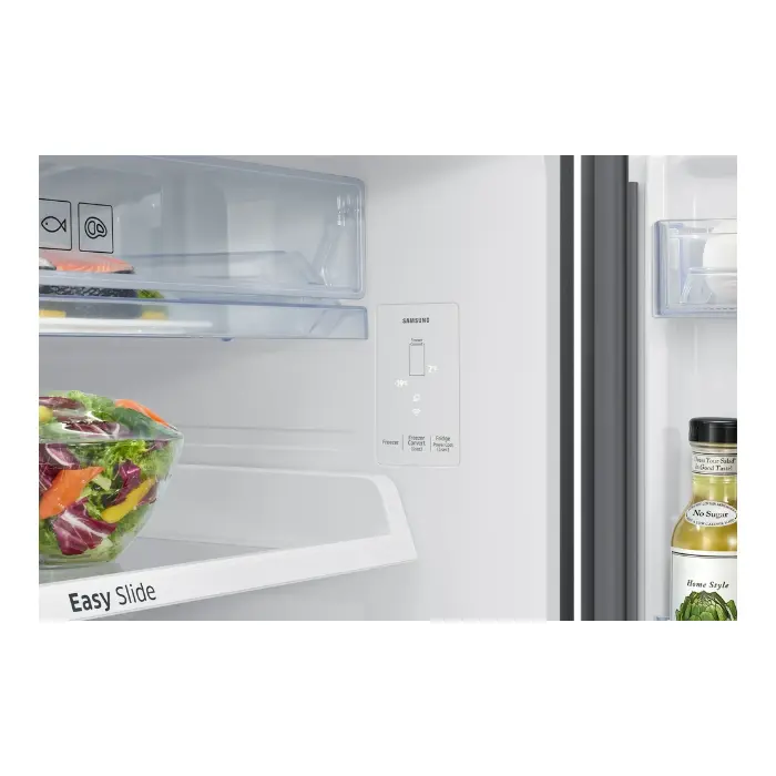 ثلاجة بابين سامسونج مزودة بدرج مخصص لتخزين الفواكه والخضروات بسعة كبيرة، يساعد على حفظها طازجة لفترات أطول. تصميمه العملي يتيح لك فرز الأصناف بسهولة والاحتفاظ بها منظمة.