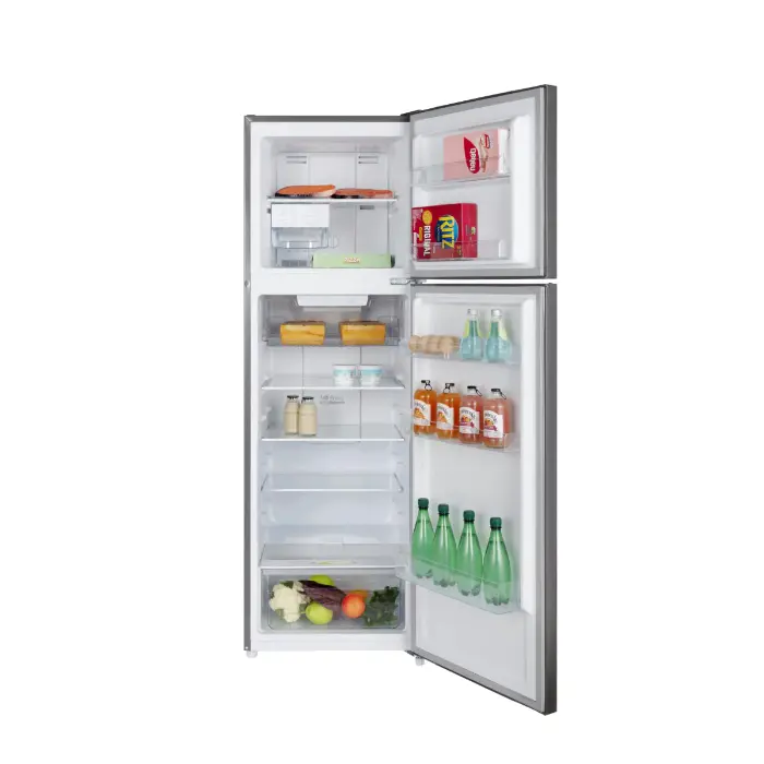 تم تصميم الثلاجة ببابين مع فريزر علوي لتوفير تنظيم عملي ومساحة تخزين منفصلة للأطعمة الطازجة والمجمدة، ما يسهل الوصول إلى المنتجات المختلفة بسرعة وسهولة.