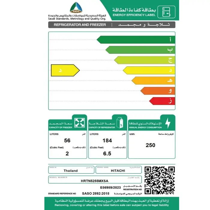 - حيز الثلاجة: 184 لتر (6.5 قدم³)